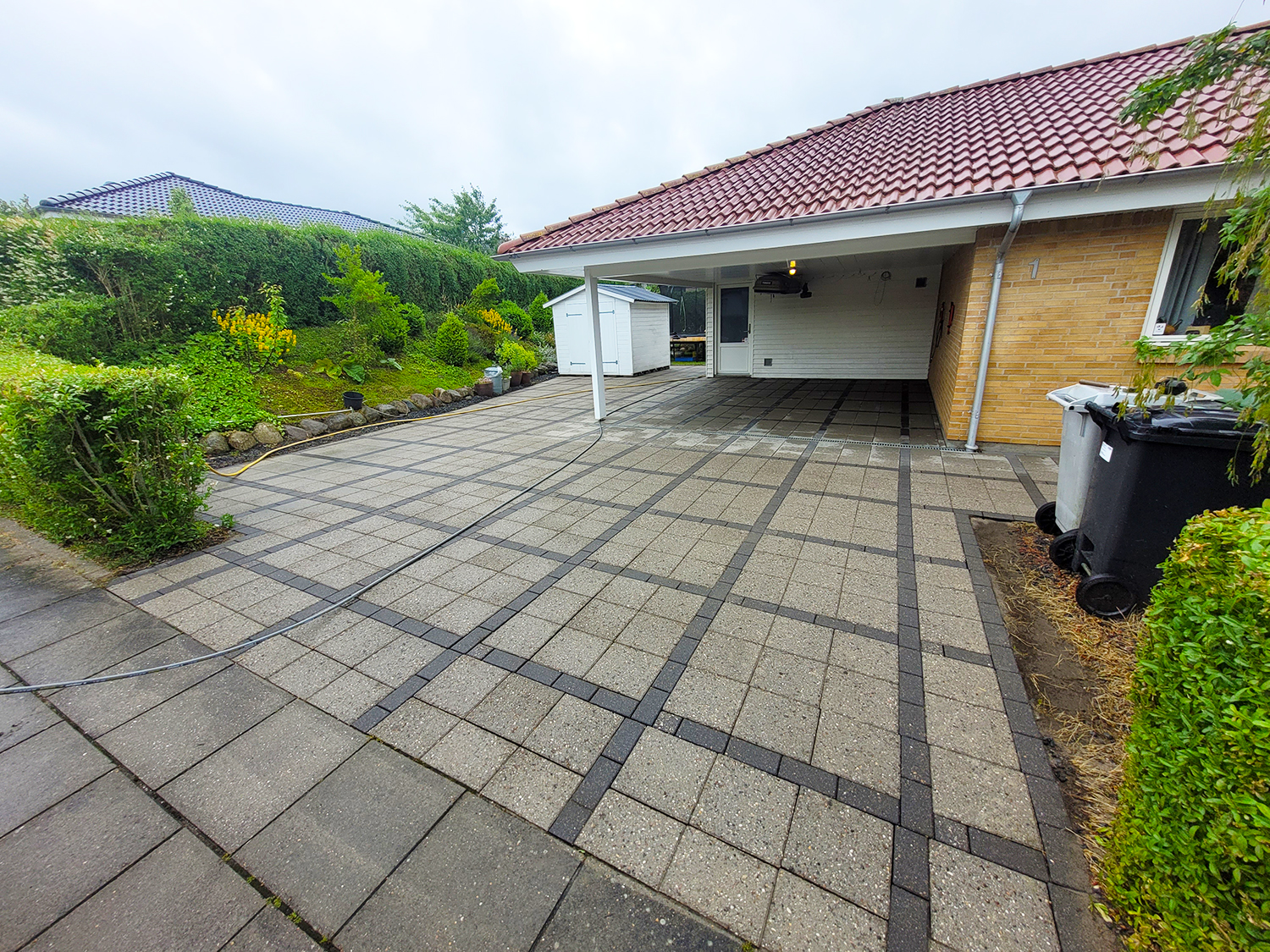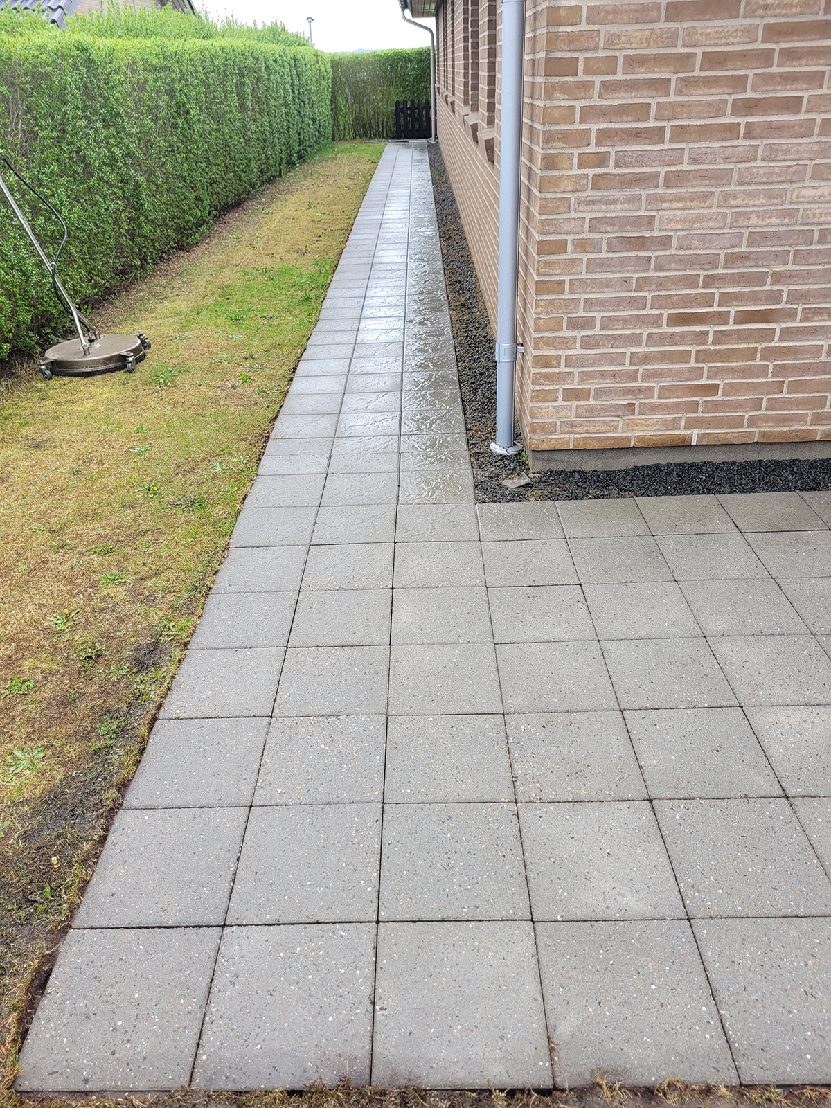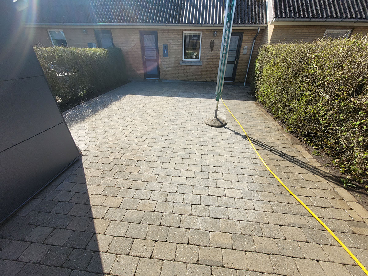 Terrasse og gangbaner med holmegaardsssten renset for privat kunde i Smedstrup ved Aalborg. Herudover er