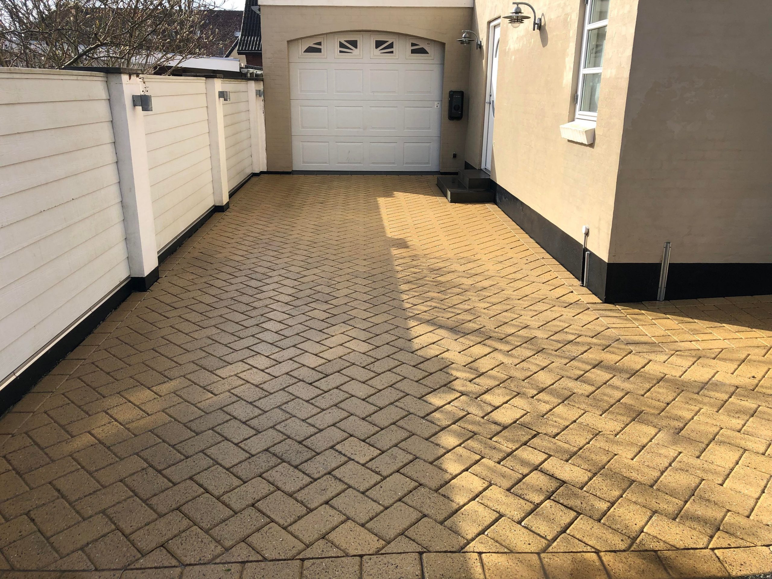 Mindre areal med fliser i indkørsel renset med skånsomt med højtryksrenser (hedvand) og efterfølgende imprægneret