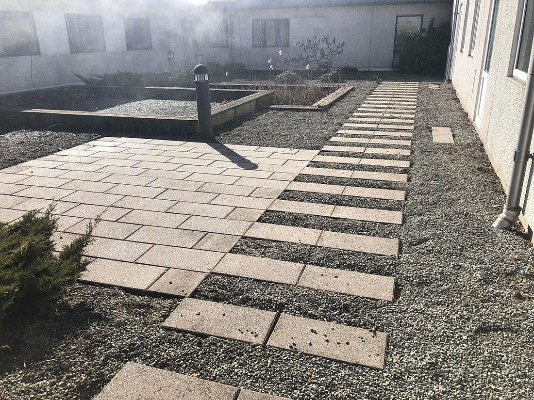 85 m2 terrasse, indkørsel samt gangbaner renset hos privat kunde i Risskov ved Århus. Fliserne